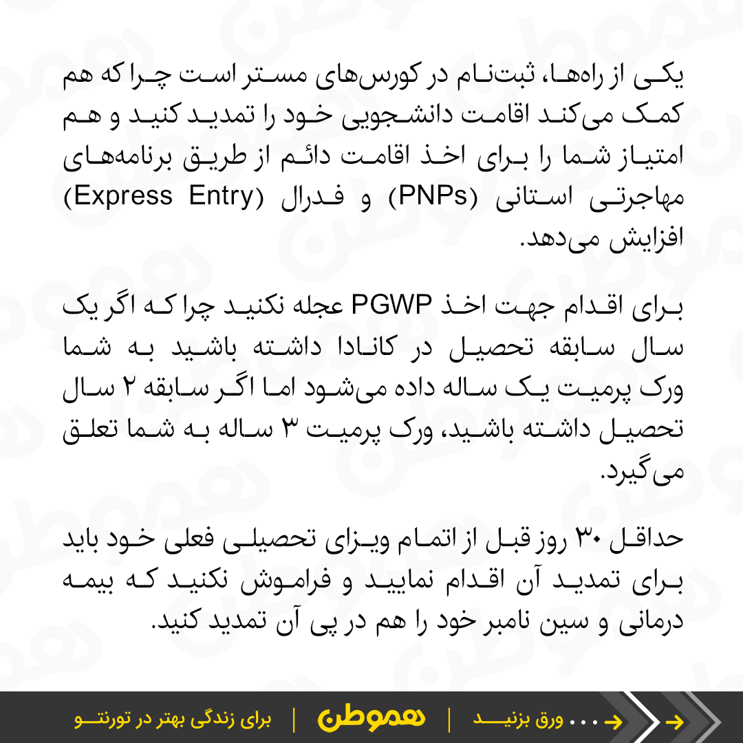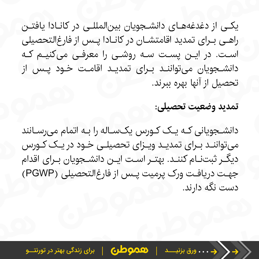 یکی از دغدغههای دانشجویان بینالمللی در کانادا یافتن راهی برای تمدید اقامتشان در کانادا پس از فارغالتحصیلی است. در این پست سه روشی را معرفی میکنیم که دانشجویان میتوانند برای تمدید اقامت خود پس از تحصیل از آنها بهره ببرند.