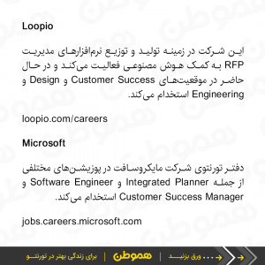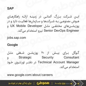 توجه داشته باشید که پوزیشنهای شغلی مورد نیاز، محدود به مواردی که در اسلایدها عنوان شدهاند نیست، بنابراین برای دیدن لیست کامل پوزیشنها و شرایط آنها حتما به لینک مرتبط با هر شرکت مراجعه کنید.
