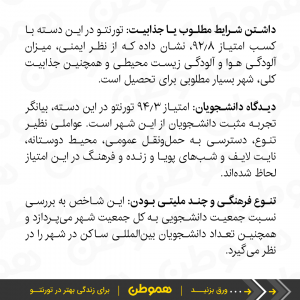 این رتبهبندی بر اساس ۵ حوزه مهم و مرتبط با زندگی دانشجویی در شهرهای جهان، تهیه شده است. دو شهر مونترال و تورنتو هر دو توانستهاند امتیازهای خوبی در چندین حوزه کسب کنند.