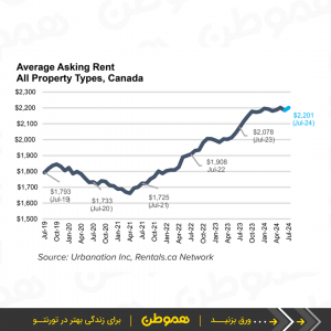 طبق این گزارش، متوسط کلی اجاره مسکن در کانادا (Asking rents) در ماه جولای به ۲۲۰۱ دلار افزایش یافته که نسبت به جولای سال گذشته، ۵٫۹ درصد بالاتر رفته.