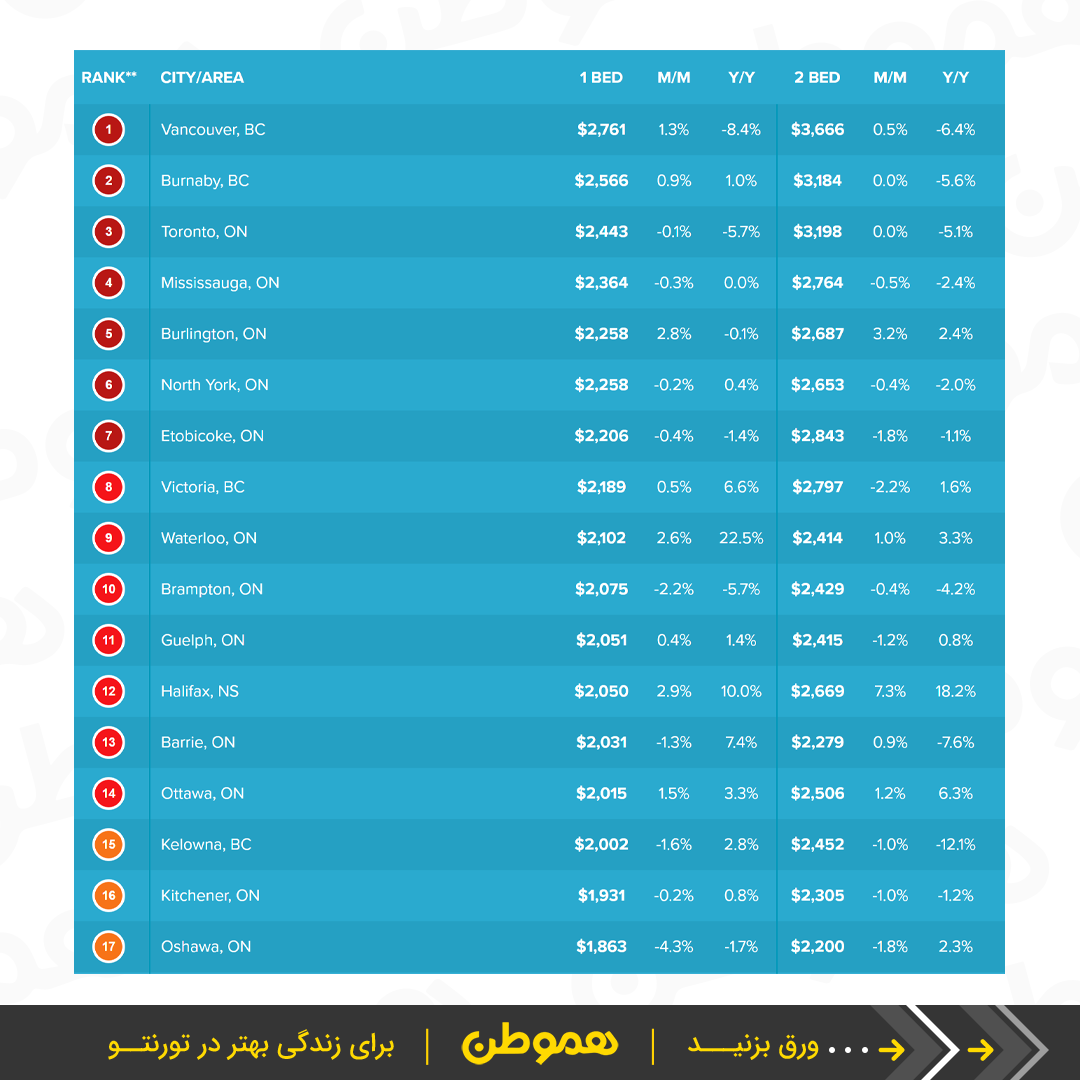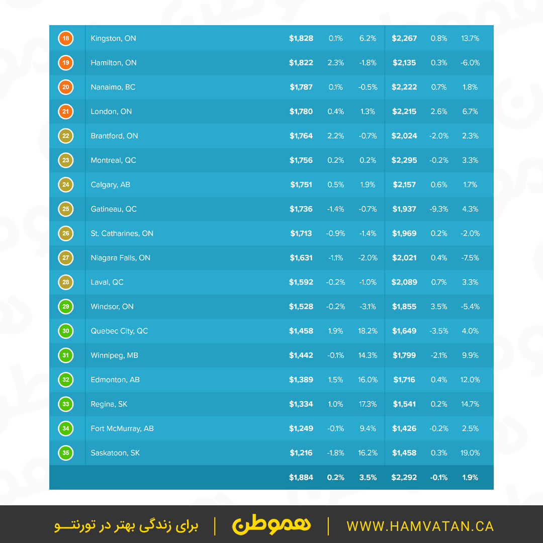 طبق این گزارش، متوسط کلی اجاره مسکن در کانادا (Asking rents) در ماه جولای به ۲۲۰۱ دلار افزایش یافته که نسبت به جولای سال گذشته، ۵٫۹ درصد بالاتر رفته.