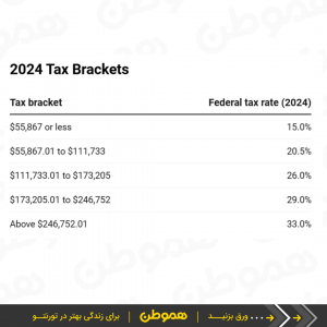 در کانادا، کل درآمد شما با یک نرخ مشخص مشمول مالیات نمیشود. بلکه، درآمد شما به چند پله مالیاتی یا همان براکت مالیاتی تقسیم میگردد و هر پله با نرخ جداگانهای مشمول مالیات میشود.