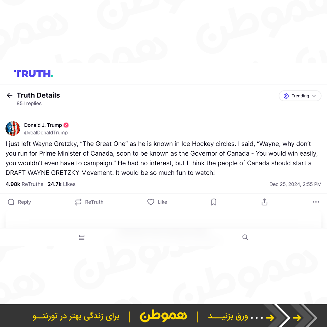 کریسمس امسال با یک اتفاق عجیب همراه بوده. دونالد ترامپ، رئیسجمهور منتخب آمریکا، با اسطوره هاکی کانادا، وین گرتسکی (Wayne Gretzky) دیدار داشته و به او پیشنهاد داده که برای نخستوزیری کانادا کاندید شود!