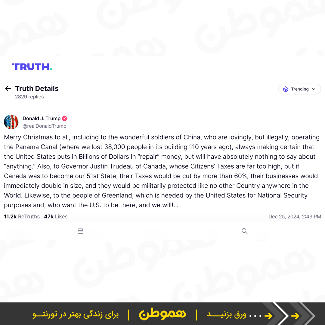 او همچنین در پیام کریسمسی دیگری، جاستین ترودو را دوباره «فرماندار کانادا» خطاب کرده و گفته که اگر کانادا به ایالت پنجاه و یکم آمریکا تبدیل شود، مالیاتهای مردم کانادا بیش از ۶۰ درصد کاهش پیدا میکند، تجارت آنها دو برابر میشود و از لحاظ نظامی به بهترین شکل حفاظت خواهند شد.