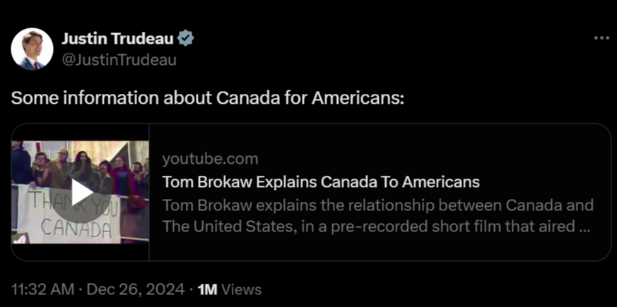 جاستین ترودو که تاکنون درباره طعنههای ترامپ در مورد کانادا به عنوان ایالت پنجاه و یکم کانادا سکوت کرده، روز باکسینگ دی (۲۶ دسامبر) با انتشار ویدیویی در توییتر، واکنش مختصری به این سخنان ترامپ نشان داده است.