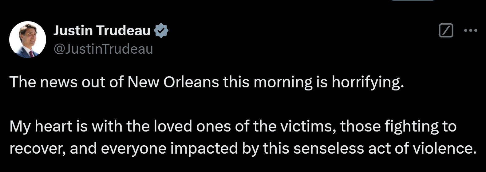 او در توییتر نوشته: «اخبار صبح امروز نیواورلئان وحشتناک است. قلب من در کنار عزیزان قربانیان، کسانی که برای بهبودی میجنگند و همه کسانی است که تحت تأثیر این اقدام خشونتآمیز بیمعنی قرار گرفتهاند.»