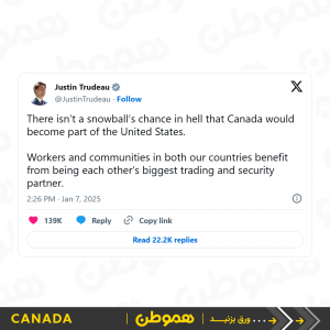 ترودو در پست خود برای تأکید بیشتر، از اصطلاح snowball’s chance in hell استفاده کرده. یعنی احتمال ادغام کانادا با ایالات متحده، به اندازه شانس بقای گلوله برف در جهنم است.
