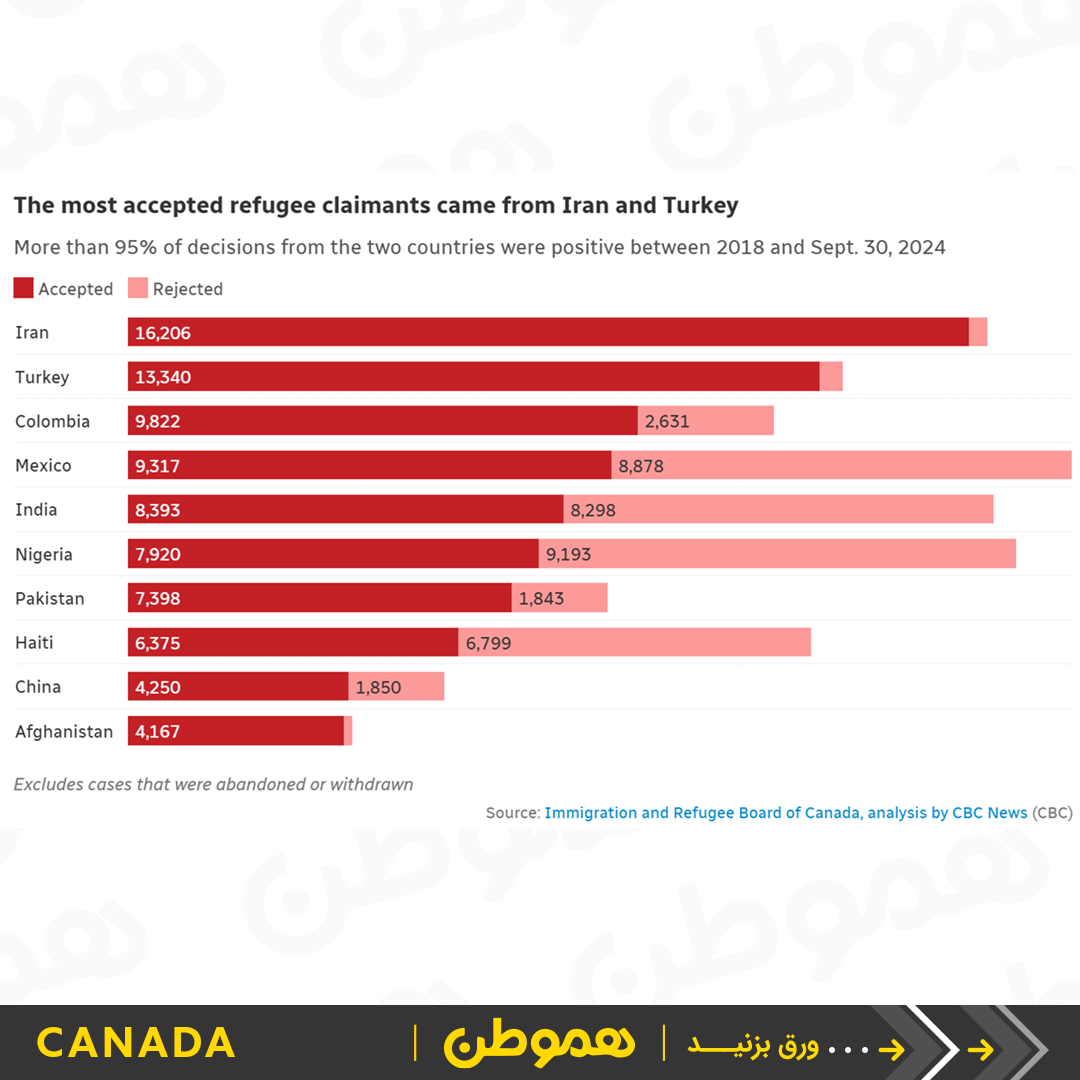 بررسیهای CBC نشان میدهد که میزان پذیرش درخواستهای پناهندگی در کانادا در طی شش سال گذشته بیش از دو برابر شده است. در سال ۲۰۲۳ حدود ۳۷ هزار نفر پناهندگی دریافت کردهاند، در حالی که این رقم در سال ۲۰۱۸ تنها ۱۴ هزار نفر بوده.
