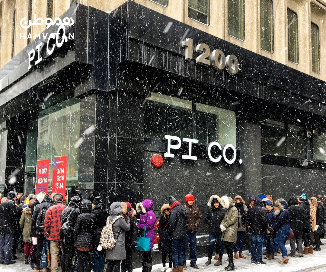 در تورنتو یک رستوران به نام Pi Co هست، که به مناسبت روز عدد پی، پیتزا با قیمت ۳٫۱۴ دلار میدهد. جالب است بدانید که هر سال یک صف طولانی هم برای گرفتن پیتزا در مقابل این رستوران تشکیل میشود.