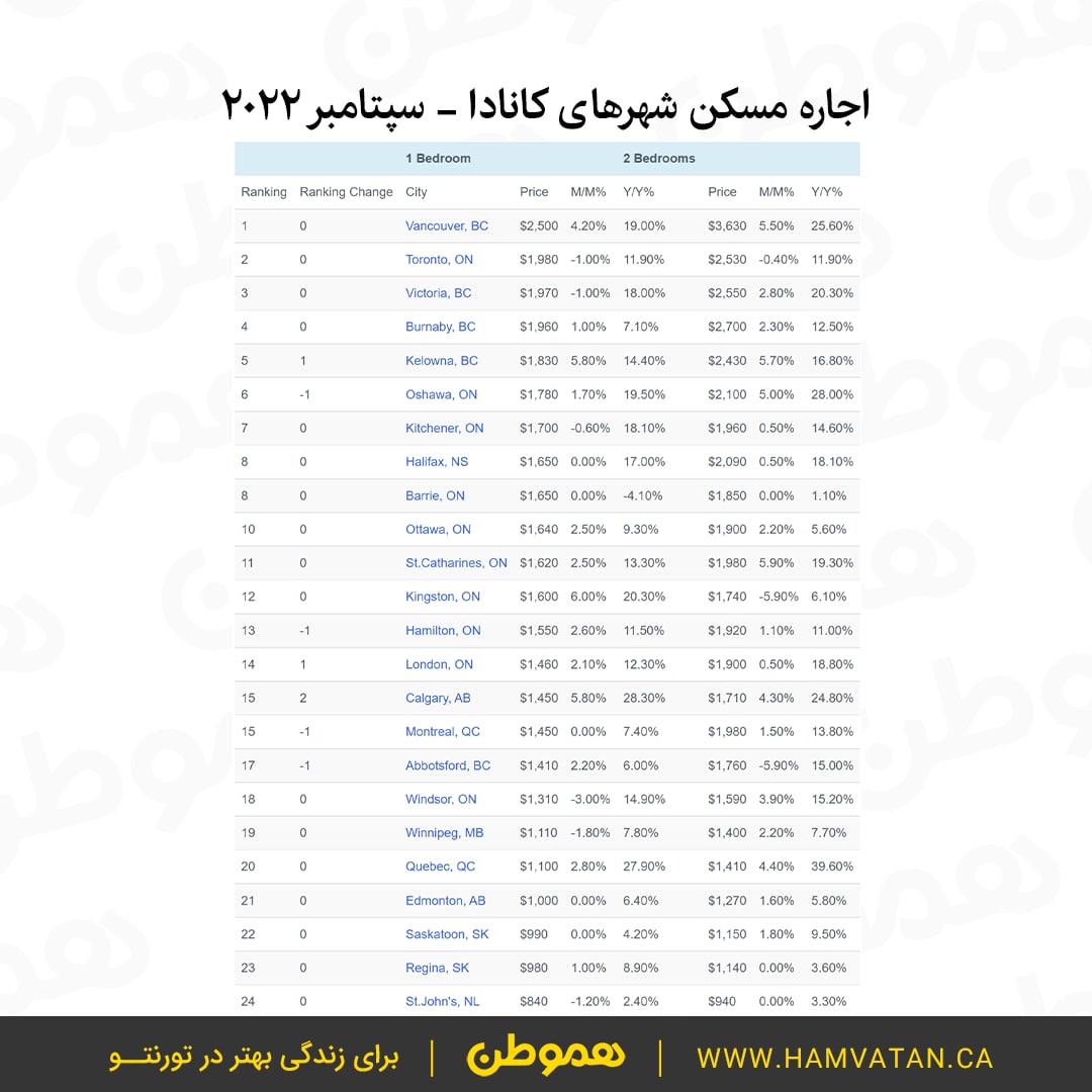 🔻گرانترین شهرهای کانادا برای اجاره مسکن دو خوابه در سپتامبر ۲۰۲۲: