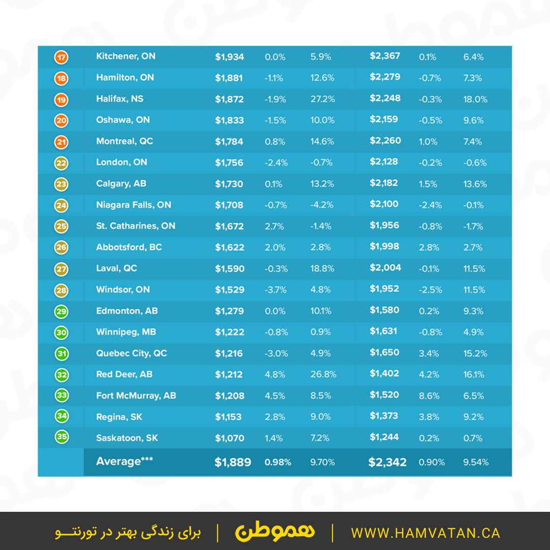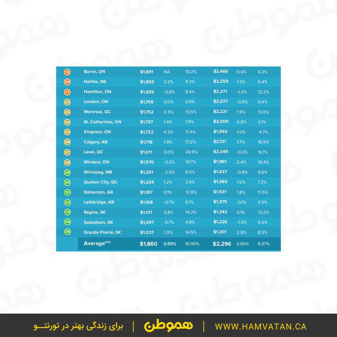 در ادامه می توانید «نمودار تغییرات متوسط اجاره مسکن در کانادا» و «میانگین اجاره در شهرهای اطراف تورنتو و دیگر شهرهای بزرگ کانادا» را ببینید.