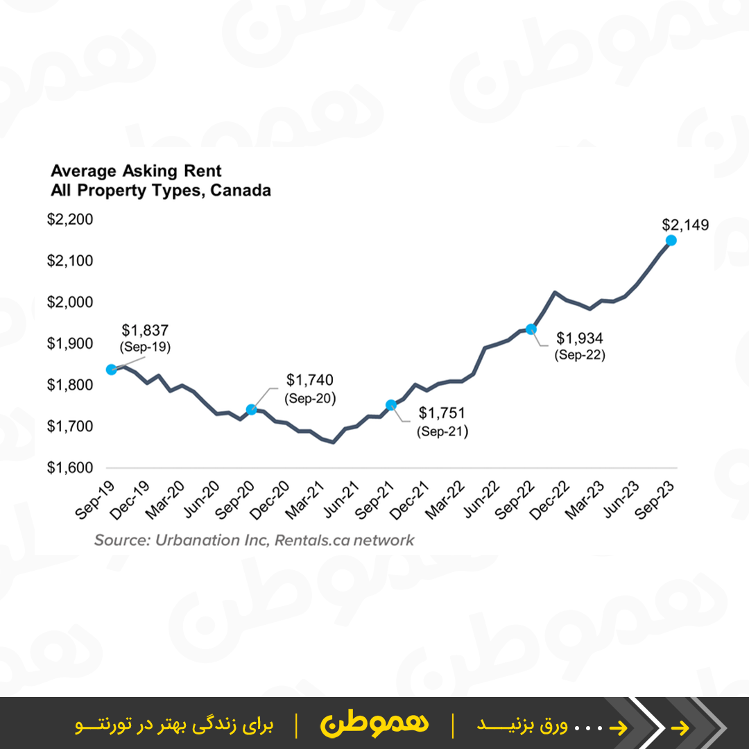 طبق این گزارش، متوسط کلی اجاره مسکن در کانادا (Asking rents) دوباره رکورد زد و به ۲۰۷۸ دلار رسید.