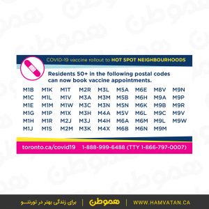 علاوه بر این، افراد بالای ۵۰ سال در مناطق پرخطر شیوع کرونا هم می توانند برای دریافت واکسن_کرونا نوبت بگیرند. برای مشاهده کدپستی مناطق پرخطر شهر تورنتو روی تصویر زیر کلیک کنید.