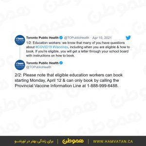 پروسه واکسیناسیون کارکنان آموزشی و معلمان تورنتو از امروز دوشنبه ۱۲ آپریل آغاز می شود.